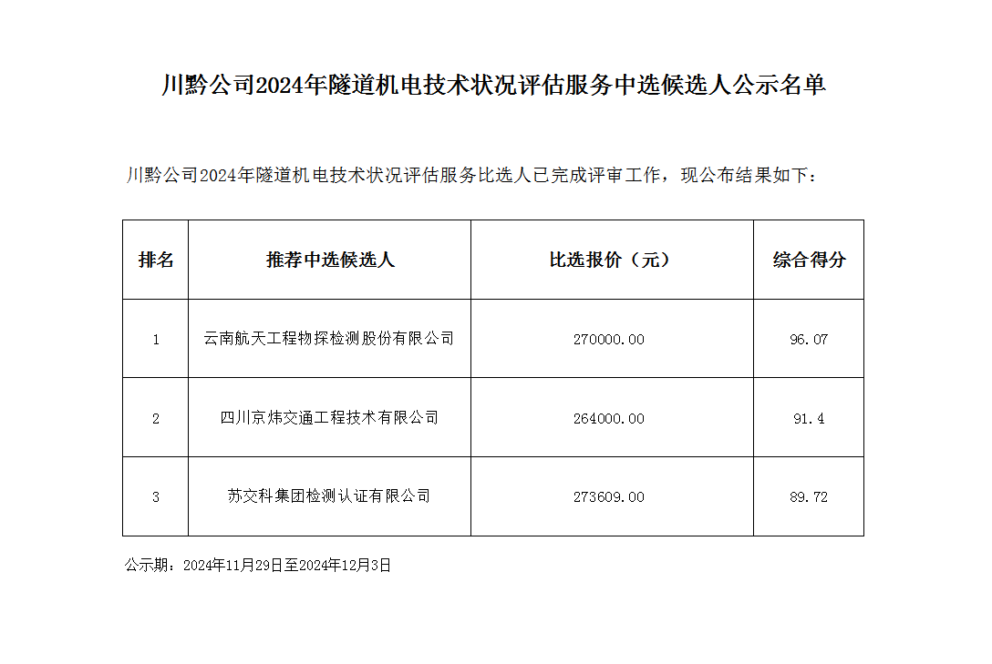 川黔公司2024年隧道機(jī)電技術(shù)狀況評(píng)估服務(wù)中選候選人公示名單
