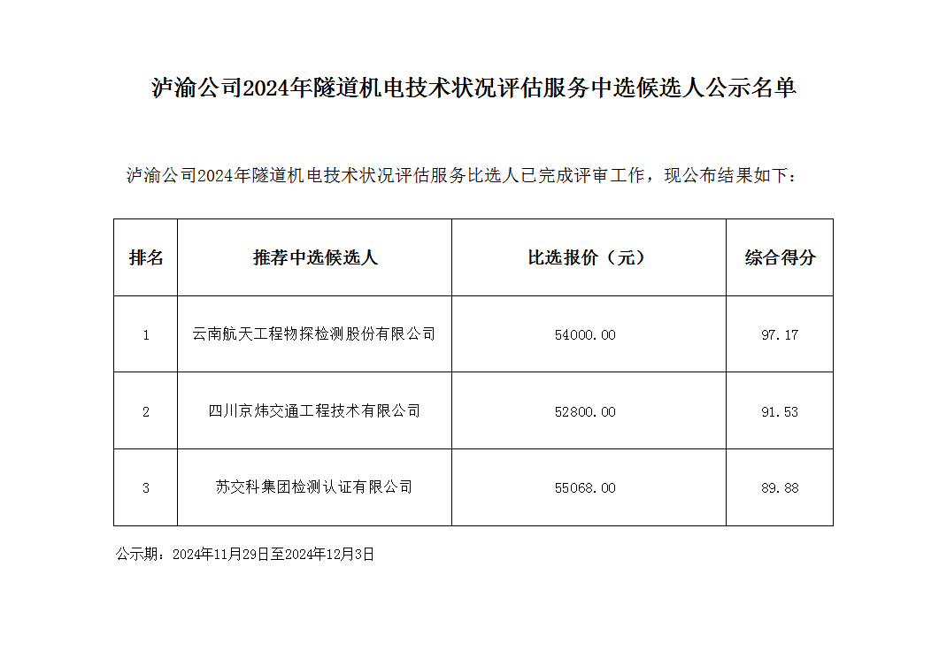 瀘渝公司2024年隧道機電技術(shù)狀況評估服務(wù)中選候選人公示名單