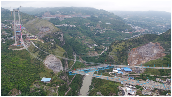 貓道,是懸索橋施工過程中獨有的作業平臺,根據施工設計要求,在四川岸和貴州岸主塔之間分別架設一根主纜,以主纜為中心,向下1.5米的地方各設置一條寬度為4米的貓道。貓道系統由承重、扶手索、門架、橫向通道等十余個部分組成,其主跨長1200米,兩岸邊跨共530米,總長1780米,左右幅貓道間距為27米,每隔一段距離建一條連接道。“貓道”施工分為單線往復式牽引系統、托架及托架承重繩、貓道承重繩、變位下壓架等關鍵節點。其中,最驚心動魄的當屬“貓道”橫向通道架設和面網鋪裝,在距離谷底四百多米的高空上,峽谷內的高空風力在6級上下,普通人連站在塔頂都會感到手腳發軟頭暈目眩,而經驗豐富的作業工人們身上系著安全帶,腳踩一根根直徑僅54毫米的鋼繩,用扳手鉚緊“貓道”面網的扶手繩、安裝兩跨“貓道”之間的橫梁門架,從兩岸塔頂往中跨小心翼翼地進行面網的鋪裝,大有昔日紅軍四渡赤水、飛奪瀘定橋的英勇豪邁氣概。已經搭建好的“貓道”面層由粗細鋼絲網、防滑木條、門架橫梁及鐵絲防護網等組成,橫向通道及“貓道”面層是在橋塔兩側的工作平臺組拼,“貓道”面采用預制成拼裝網片單元分段鋪設。作為主纜架設和鋼桁吊裝施工的重要施工便道,建設者們將借助它來進一步完成主纜索股牽引、吊索安裝、鋼桁梁吊裝、主纜纏絲防護等施工步驟。
