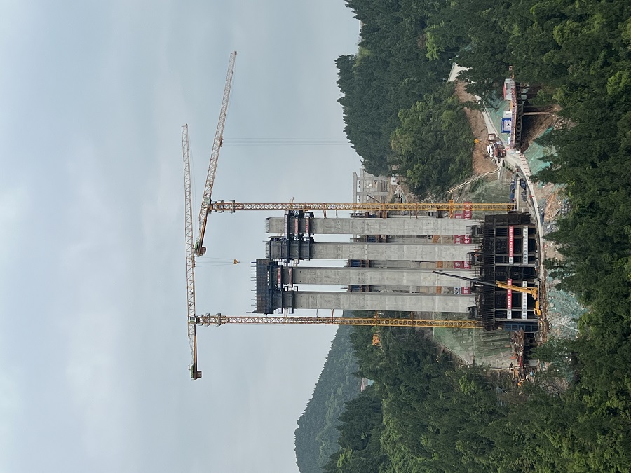 水落河特大橋起點岸(古藺岸)接龍山服務區,終點岸(金沙岸)接路基段,主橋采用計算跨徑335m上承式鋼筋混凝土懸臂澆筑拱橋,主橋橋面采用跨徑11×31.75m的預應力混凝土簡支Ⅰ梁+組合橋面板,左幅全長1721.25米,右幅全長1676.20米,道路設計為雙向6車道,時速100公里/小時。該橋區山勢陡峭,兩岸堤壩近乎直立,橋面至谷底高差250.104米,其施工難度巨大。該橋首次采用高流態C80低收縮高韌性纖維混凝土,并創新使用掛籃內外模液壓智能同步爬升技術。建成后將是目前世界上最大跨徑懸澆拱橋,在橋梁發展史上具有里程碑意義。